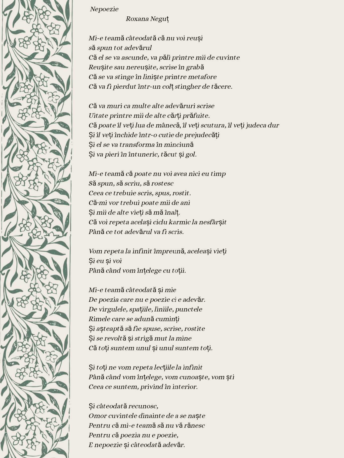 Dragi prieteni, incepem anul cu limonada poetică, o poezie ” Nepoezie” din următorul volum” Teoria Haosului ” – Cine privește in exterior viseaza, cine privește in interior, se trezește. Carl Jung