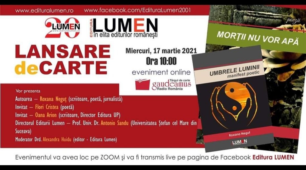Editura LUMEN va invita la evenimentul online LANSARE DE CARTE “MORTII NU VOR APA”, EDITURA LUMEN, 2019 SI “UMBRELE LUMINII. MANIFEST POETIC”, EDITURA LUMEN, 2020, AUTOR: ROXANA NEGUT, organizat in cadrul editiei martie 2021 a Targului GAUDEAMUS Radio Romania (01-31 martie 2021).