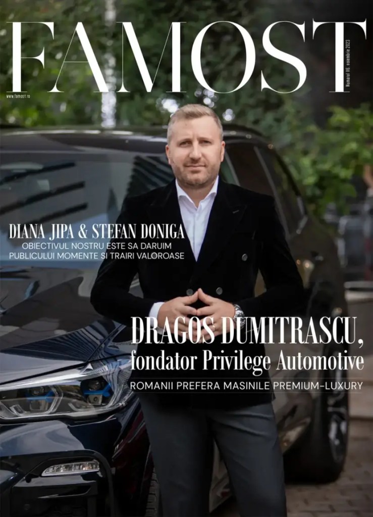 Dragoş Dumitraşcu, fondator Privilege Automotive, se află pe coperta revistei noastre şi la interior cu un interviu în care ne povesteşte despre dinamica industriei auto, care sunt tendinţele acesteia, ce oferă brandul său, dar şi care sunt dorinţele românilor în privinţa maşinilor. Diana Jipa şi Ştefan Doniga, creatorii conceptului ROMÂNIA UNIVERSALIS care duce numele României în orice colţ al lumii prin intermediul muzicii, ne vorbesc într-un interesant interviu despre muzică, cultură, lucruri frumoase; material realizat în colaborare cu Adriana Godeanu Metz. Georgia Dascălu, o prezenţă fresh în fiecare dimineaţă pe micile ecrane, este în dialog cu Daniela Sala, oferindu-ne informaţii frumoase despre cariera şi viaţa sa, modul în care a ajuns să lucreze în televiziune.