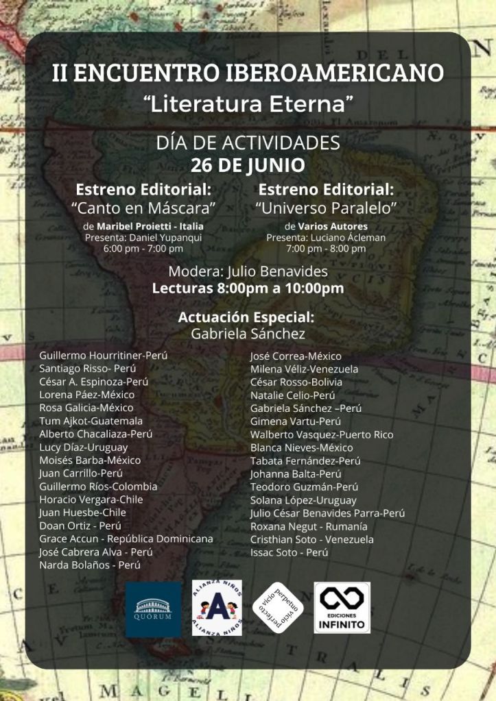 Poeți și scriitori din Peru, Mexic, Argentina, Italia, Venezuela, Chile, Spania, Guatemala, Uruguay, Republica Dominicană și multe alte colțuri ale lumii se reunesc pentru a celebra cuvântul, emoția și visul comun numit literatură. Eveniment este organizat de scriitorul și editorul Julio César Benavides Parra. Mulțumesc frumos pentru invitatie!